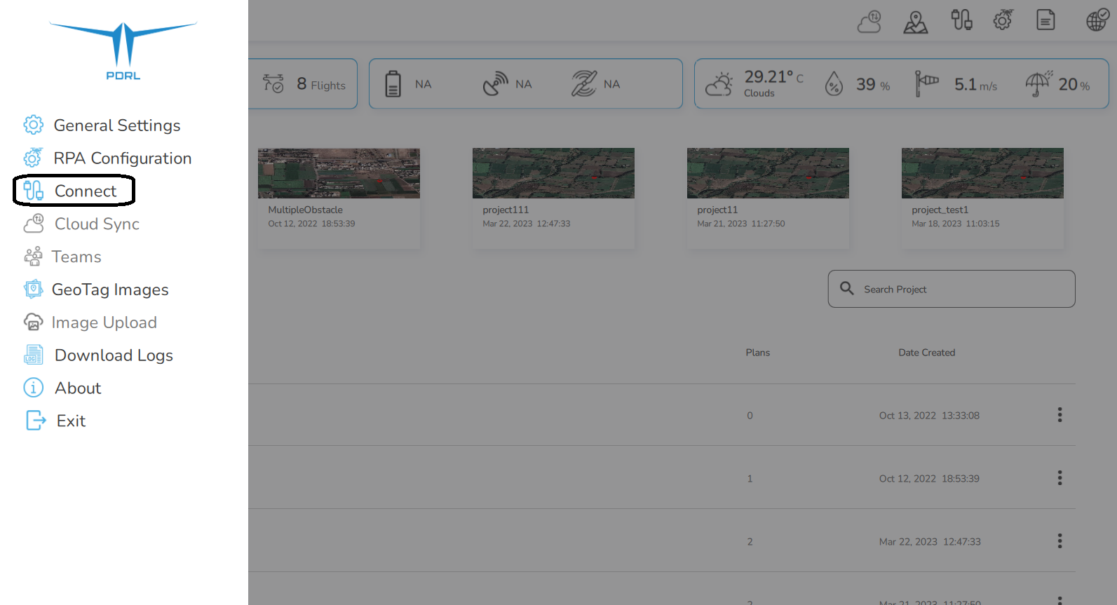 <figure><img src="https://1788363282-files.gitbook.io/~/files/v0/b/gitbook-x-prod.appspot.com/o/spaces%2F-MdXEPSSaxxxwXMJ4joo%2Fuploads%2FqcRTrsyQRIAzNVH1PCVg%2Fimage.png?alt=media&#x26;token=dda96639-0027-48a7-aa71-c2b3f5bf3e36" alt=""><figcaption><p>Connect a Drone before creating a Project</p></figcaption></figure>