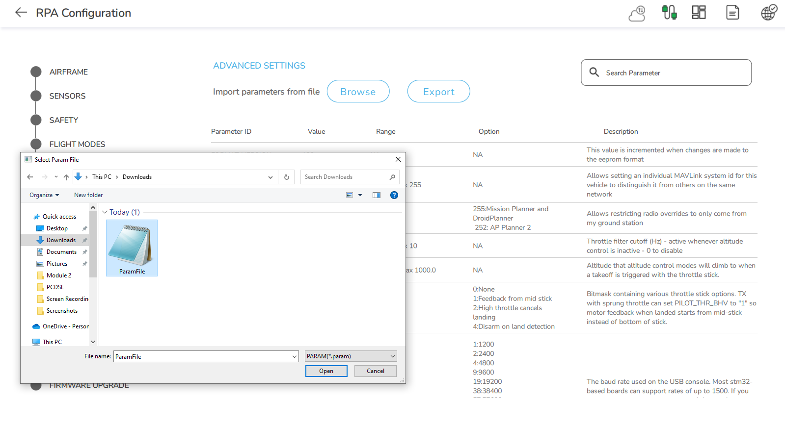 AeroGCS KEA 2.3 allows the user to import the parameters from an existing '.param' file by clicking on the "Browse" button. Select the required .param file from your local computer to open and use it.
